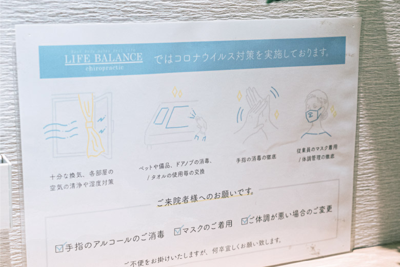 当院では感染対策を徹底しております。ライフバランスでは、千葉県の店舗運営の為のコロナ対策に則り、最新の注意をして営業しております。