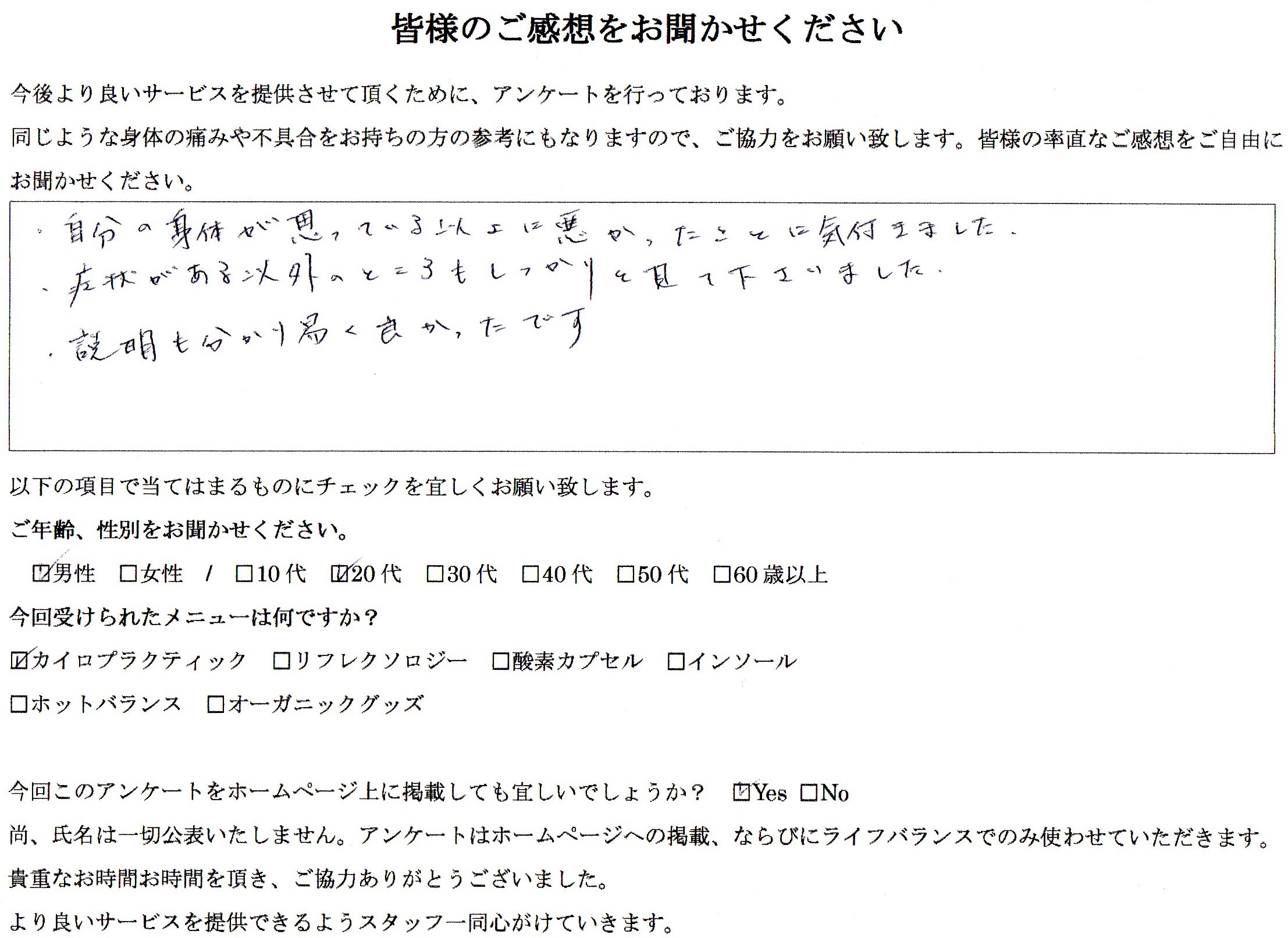 HOME > お客様のお声 > 体が思っている以上に悪かった。 2025年8月12日 ご予約方法 ライフバランスでは、WEB予約・LINE予約の2つの方法をご用意しています。ご都合の良い方法でお気軽にご予約ください。 WEB予約 24時間いつでも予約可能。空き状況を確認しながらスムーズにご予約いただけます。 WEB予約する LINE予約 公式LINEから簡単予約。ご質問や事前相談もLINEでお気軽にどうぞ。 LINEで予約 お電話でのご予約も承っております: 047-361-1233 この記事を書いた人 最新記事 ライフバランス ホームページへのご訪問ありがとうございます。千葉県松戸市の国際基準のカイロプラクティック・整体のライフバランスでございます。 〒271-0092 千葉県松戸市松戸1836目黒ビル2階、 ☎︎047-361-1233 2026/01/1965歳を過ぎても元気に動く! 2026/01/19じゃあ、あんたが作ってみろよ~出汁の魅力 2026/01/19身体に意識を向けてみよう ライフバランスの記事をもっと見る -お客様のお声